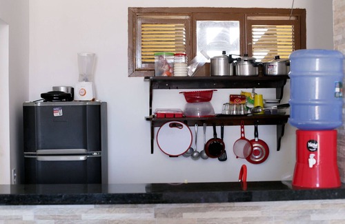 - A cozinha americana possui diversos utensílios para preparar refeições, incluindo cafeteira, fogão, forno, geladeira, liquidificador, sanduicheira e balcão