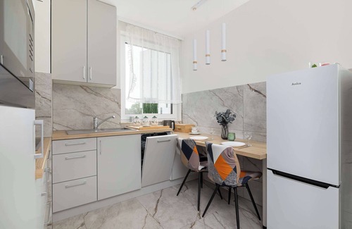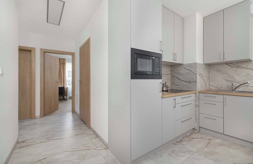 This modern building is located in a quiet and friendly neighborhood, making it a great place to unwind for couples as well as groups of friends, business travelers or parents with children. The property has to offer visitors parking spaces in an underground garage hall. The property is located close to numerous stores, retail outlets, restaurants and cafes. The two nearest stores are located just a three-minute walk from the building. A nearby eatery and bakery can be reached in just five minutes. The property is close to the Tauron Arena, to which the distance can be covered on foot in just twenty minutes, as well as to the nearby Aviators Park. It takes only ten minutes by car to reach the Old Town, where you can admire the magnificent architecture and numerous monuments. The route to the tennis court, the shopping center, the outdoor gym, the park, the swimming pool and the train station, on the other hand, takes only six to eight minutes. Less than half an hour is enough to reach the airport. The place is well connected with the rest of the city - only a few minutes separate the building from numerous bus and streetcar stops.