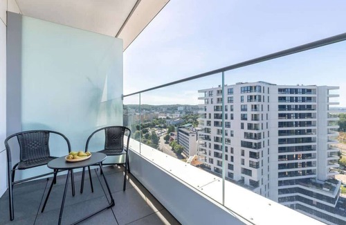 This modern and comfortable apartment is located on the fifteenth floor of the building and is designed for four people. Guests can enjoy a beautiful scenic view of the city and the bay from the furnished balcony, which has a table with chairs. This makes it possible to drink morning coffee and eat snacks outdoors in a relaxed atmosphere. The decor is dominated by a subdued, elegant color scheme. The interior design uses shades of gray, black and beige, making the establishment stylish yet cozy. The living room features a television with access to terrestrial channels, a light gray corner sofa bed and a dining table with chairs ideal for serving and dining. Dishes and snacks can be easily prepared in the practically equipped kitchenette - guests can find an induction hob, oven, and electric kettle here. Also located in the living area is a roomy closet with an iron, ironing board and vacuum cleaner. It is ideal for storing brought items such as clothes, shoes or handy trinkets. The bedroom houses a double bed along with cabinets. The bathroom has a welcome toiletries kit, shower, towels and hair dryer to offer visitors.