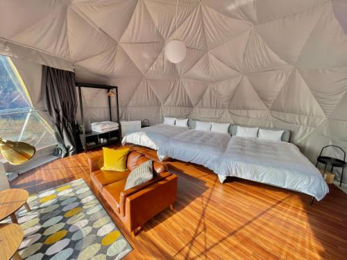 Offering mountain views, レドンド秋吉台 in Ōta provides accommodations, a garden, barbecue facilities, and a shared lounge. This luxury tent offers free private parking and private check-in and check-out. Outdoor seating is also available at the luxury tent. Each unit has air conditioning, a private bathroom, and a fully equipped kitchenette including a fridge and kitchenware. At the luxury tent, all units are allergy-free. At the luxury tent, units are equipped with bed linen and towels. Outdoor play equipment is also available for guests at レドンド秋吉台. Ejio Park is 21 miles from the accommodation, while Tokiwa Museum is 24 miles from the property. Yamaguchi Ube Airport is 28 miles away.