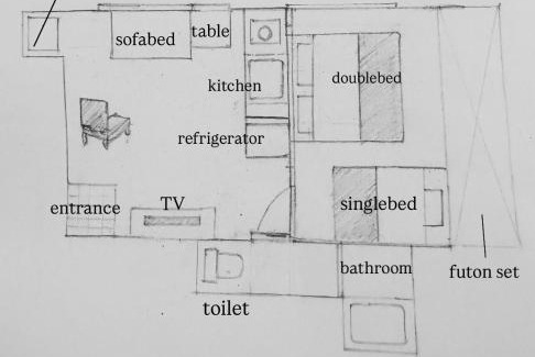 BathroomBody soap, Toilet paper, Toilet, Bathtub or shower, Towels, Private bathroom, Bathtub, Slippers, Shampoo, Conditioner, Toothbrush, HairdryerMedia & TechnologyTV, Flat-screen TV, Streaming service (like Netflix)GeneralFire extinguisher, Smoke Alarm, Trash cans, Key access, Air conditioningKitchenElectric kettle, Kitchenware, Washing machine, Microwave, Kitchenette, RefrigeratorLiving AreaDesk, SofaAccessibilityUpper floors accessible by stairs onlyRoom AmenitiesSofa bed, Socket near the bed, Non-feather pillowSafety featuresAir purifiersPhysical distancingSingle-room AC for guest accommodationCleanliness & disinfectionHand sanitizer |