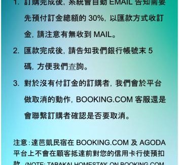 Based on the information reported by the owner or manager, details for the cancellation policy for the 達芭凱民宿 Tabakai B&B are as follows: Free cancellation Guests are cautioned that the cancellation policy may differ based on seasonality, availability, or current travel restrictions. Guests should also be aware that this policy may be subject to change and should be confirmed prior to booking. More details may be available on this page in the property description. However, early check-in or late check-out can sometimes be negotiated between the guest and the owner or the manager of this property.