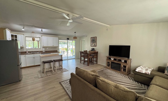 This newly renovated coastal modern 2 bed, 2 bath home is designed to make your stay unforgettable. Step into comfort and style and explore this fun, inviting space. Whether it be the tiki bar, the kids corner, a Bon fire, or picking fresh fruit from one of the lemon or loquat trees, there is something for the whole family to do! This home is guaranteed to provide a clean, cozy, and pleasant stay for all.