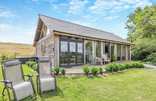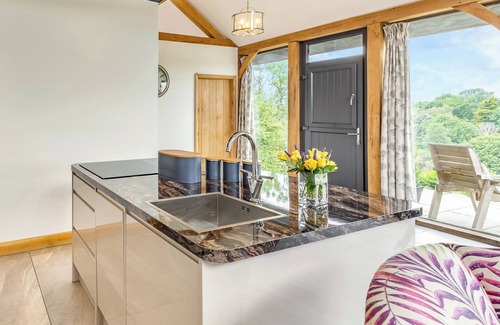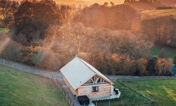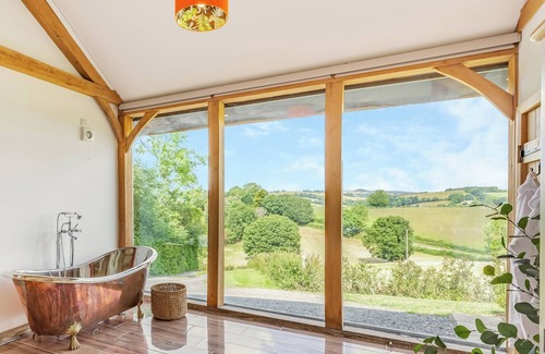 Shower Room: Cubicle Shower, Heated Towel Rail, Toilet. Electric underfloor heating, electricity, bed linen, towels and Wi-Fi included. Welcome flowers, complementary tea, coffee and milk and homemade Welsh cakes. Front garden with patio, garden furniture and BBQ. Hot tub for 2 (private). Private parking for 2 cars. No smoking. Enclosed garden for dogs. Please note: There is an unfenced lake in the grounds, 500 yards away.. Oak View is a modern, one storey, oak beamed barn nestled to the side of a woodland area, with expansive views over the mid-Wales countryside. With an open plan design, it has high quality furnishings, including a free standing, copper bathtub in the bedroom, modern amenities with well-equipped kitchen and private bathroom. The large bedroom features a wall of glass to the front elevation, allowing you to relax in bed or bathe whilst enjoying the breath-taking, secluded views. However, for convenience it is also equipped with remote control blinds. Within the living area there are triple bi-fold doors, floor to ceiling glass panels and a duel opening stable-type front door so that you can completely enjoy the scenery from inside, or easily access the garden and patio with the feature of a private hot tub. Oak Vew is a modern barn built using traditional materials so that it harmonises with its natural surroundings. Keeping with the green ethos, the owners use biomass fuel, solar and wind power to further limit the impact to the environment. Accommodation is entirely on ground floor level. Well behaved dogs are welcome at the property and the garden and patio area is enclosed.