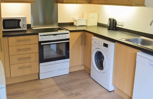 Kitchen: With electric cooker, microwave, fridge/freezer, dishwasher and washing machine.