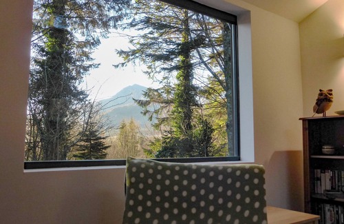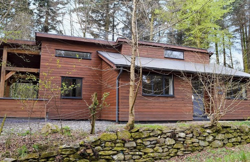 Bedroom: Double (4ft 6in) Bed Ensuite: Cubicle Shower, Toilet. Gas central heating (underfloor on ground floor) (£35 per week, October-March). Bed linen, towels and Wi-Fi included. Initial fuel for wood burner included. Welcome pack. Woodland garden with patio, sitting-out area and garden furniture. Private parking for two cars. No smoking. Please note: No children under 18 years old.. Stunning architecturally designed detached cottage, set in its own extensive woodlands with mountain views and miles of forest tracks from the doorstep. This landmark property was redesigned by leading north Wales architects to become the perfect holiday retreat. Offering a unique combination of outdoor adventure with beautiful accommodation together with peace and tranquillity to relax and enjoy.