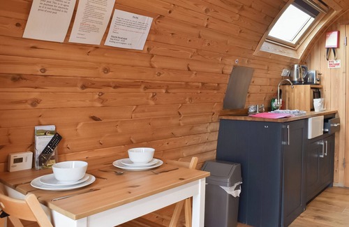 Shower Room: Cubicle Shower, Heated Towel Rail, Toilet. Biomass underfloor heating, electricity, towels and bed linen included. Large decked area with garden furniture. 1-acre landscaped grounds (shared with other properties on-site). Hot tub for 8 (private). Stabling and grazing for horses available (at cost, by prior arrangement). Private parking for 2 cars. No smoking. Please note: The property has a natural water supply from a spring.. Welcome to this luxurious glamping pod, nestled in the serene surroundings of a picturesque working farm. Designed to provide the ultimate blend of comfort and nature, it offers a delightful retreat for up to four guests.