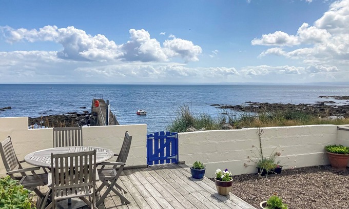 Living/dining room 2: (No TV). Electric central heating, electricity, bed linen, towels and Full Fibre Wi-Fi included. Initial fuel for open fire included. Welcome pack. Enclosed front and rear garden with patio and garden furniture. Private parking 1 car. No smoking. Please note: There is direct access onto the shoreline via the front garden.. Cross Tides is the quintessential seaside cottage. Situated in a quiet backwater lane in the fishing village of Hilton and with gardens that open directly onto the shoreline, this pretty 19th Century stone cottage is ideal for couples. The cottage benefits from full fibre WiFi throughout. There is a cosy living room downstairs with welcoming open fire and a second living/dining room upstairs with a dining table, comfy seating and stunning sea views, ideal for sitting and watching the ever changing seascape and the small fishing boats along the shoreline. There is one bedroom and a modern shower room on the ground floor. The terrace garden is attractively set with tubs and flowering plants. A small gate opens onto the beach and small fishing harbour.