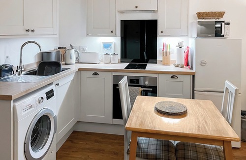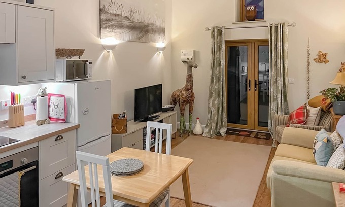 Shower Room: Walk-In Shower, Heated Towel Rail, Toilet. Underfloor central heating, electricity, bed linen, towels and Wi-Fi included. Welcome pack and doggy extras. Enclosed front and side patio area with outdoor furniture. Private parking for 1 car. No smoking. Please note: Access is via a driveway shared with the owner.. Maggie’s Place is located next to a busy working dairy farm in a rural part of Devon, so it is the perfect property to enjoy the sights, sounds and scents of the country. Inside the barn you will find a king size bedroom with adjacent shower room and an open plan living area which includes the living, dining and kitchen area. The latter has everything you need for your holiday. The living area has a double sofa bed, a TV/DVD player with a good choice of films and an Amazon fire stick.