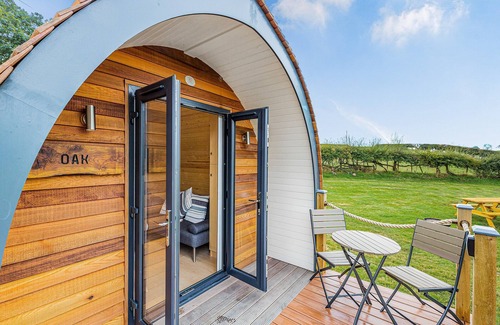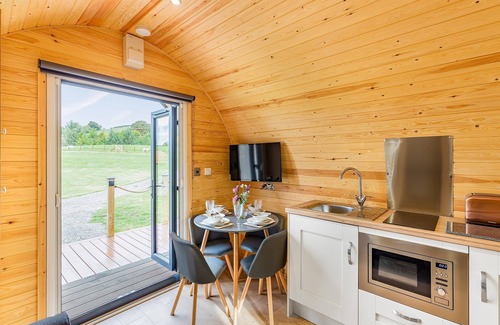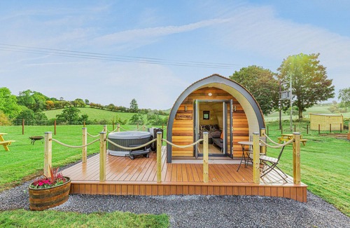Shower Room: Cubicle Shower, Heated Towel Rail, Toilet. LPG central heating, electricity, bed linen, towels and Wi-Fi included. Welcome pack. . Front garden with sitting out area, BBQ and garden furniture. Hot tub for 4 (private). Private parking for 1 car. No smoking.. Situated in the stunning Welsh countryside, this group of superior, detached boutique pods have been carefully positioned to provide guests with a peaceful and romantic holiday setting. Each pod has been created with open studio type accommodation, all on one level. This is the perfect place to escape for a romantic break, with a private hot tub provided for guests to enjoy and take in the beautiful surroundings.