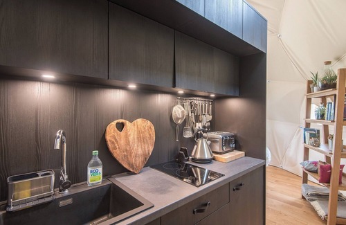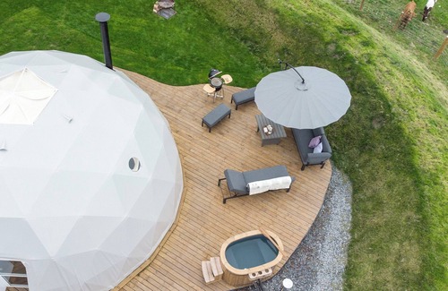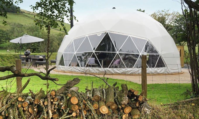 Inside the geometric dome offers a vast open-plan and beautifully appointed interior with a wood burner, underfloor heating, king-size Vispring luxury bed, Smart TV, en-suite shower room and deluxe nickel-plated copper bath next to the bed. The fully equipped kitchen has electric appliances, 2 ring hob and a combination/microwave oven. Swap the fast pace of life for cooking breakfast and lunch on the fire pit or BBQ, chill out on the outdoor sofas with a beer after a bike ride - the dome comes with two complimentary mountain bikes for use during your stay. If you are looking for a romantic glamping experience in Wales, look no further than this newly built Geo-dome, featured on Channels 5 ’Our Family Farm Rescue Aug 2021’.