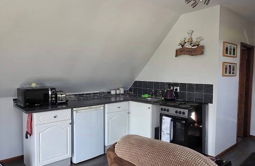 The property is located in a rural area, with breathtaking views across the countryside. The property is accessed via 13 steps so is not suitable for those with mobility issues. This lovely apartment is located above the owners’ garage and features an open plan living, dining and kitchen space, which then leads to the double bedroom and shower room. From the living area you can step out onto a small balcony where you can enjoy some great views and al fresco dining.