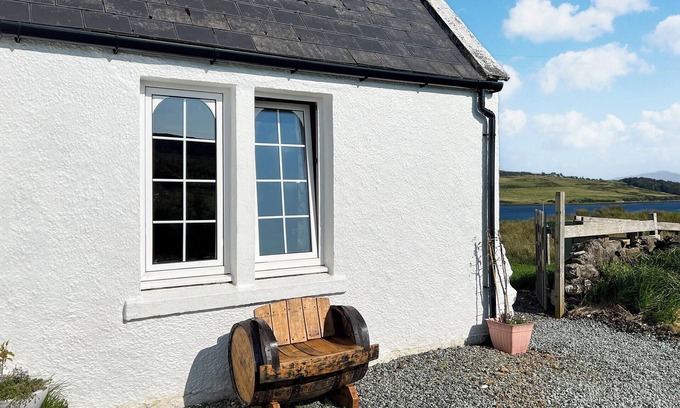 Bathroom: Bath With Shower Over, Heated Towel Rail, Toilet. Air source heat pump and solid fuel central heating, electricity, bed linen, towels and Wi-Fi included. Initial fuel for wood burner included. Welcome pack. Front and rear enclosed garden with sitting-out area, garden furniture and barbecue. Private parking for 2 cars. No smoking or E-cigarettes.. Nestled in the heart of the captivating Isle of Skye, this traditional two-bedroom croft house in Bernisdale offers an idyllic escape with views of Loch Snizort. This one-level gem combines Highland charm with modern comfort. The whitewashed stone walls of the croft house are a testament to Skye’s rich cultural heritage. Inside, a tastefully restored interior blends modern comfort with rustic appeal.