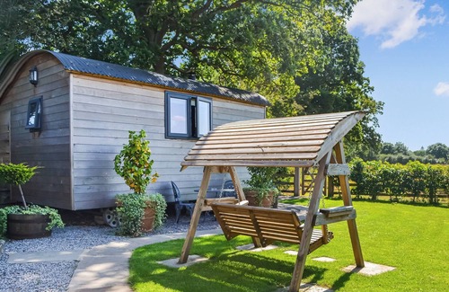 Open plan shepherds hut, oozing charm, with a wood burner and wood-fired hot tub.. 4 steps to entrance.