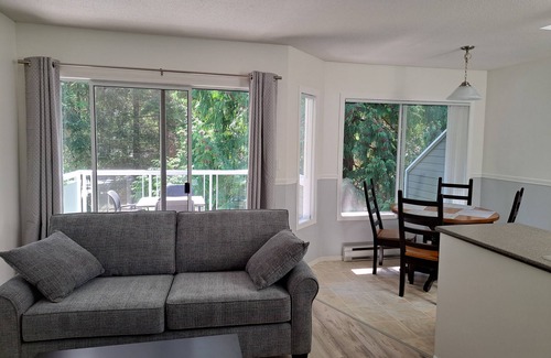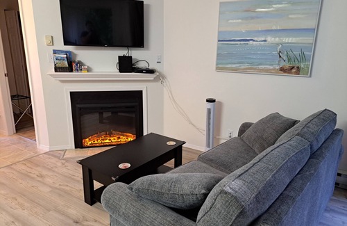 Enjoy your stay at our one bedroom 2nd level walk-up condo located a short walk from Rathtrevor beach. The main bedroom contains a queen size bed & tv with streaming channels. The open concept living area features an electric fireplace, double size pullout couch with a memory foam mattress, full kitchen and dining area. Enjoy your morning coffee or a meal on the private balcony.