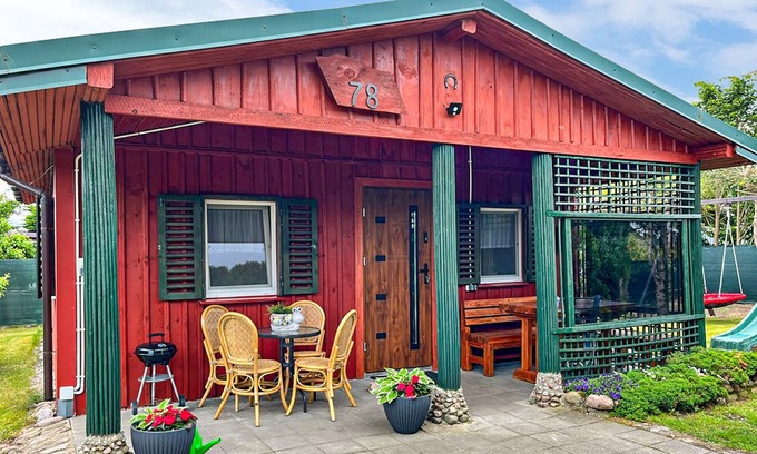 This beautiful cottage invites you to a pleasant vacation, it is located on a fenced plot. It is equipped with cozy furniture. There is also a playground and a barbecue corner on the property. Enjoy the natural landscape here, nature lovers will do well here. And in the evening after a day full of activities you can relax comfortably at the common barbecue. And that with the whole family, because your pets are also welcome here. No swimming possibilities in lake.