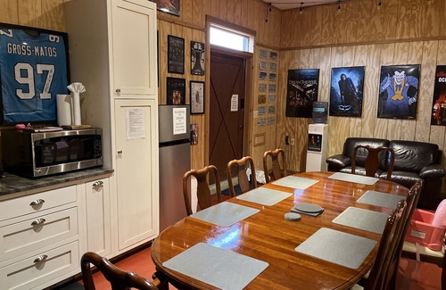 Kitchenette area includes a hot plate, toaster, toaster oven, microwave oven, coffeemaker, instant-hot tea kettle, Keurig, refrigerator, and plenty of seating at the dining room table. We provide tea, coffee, snacks, and filtered water. We also have a fully stocked vending machine for your convenience!
