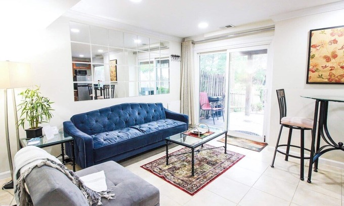 Cozy basement apartment in an end-unit townhouse with private entrance, kitchen, bath, and laundry. Includes 1 Queen bed, sofa, and small kitchenette with fridge, microwave, coffee maker, toaster, and single induction cooktop. Full bath and hardwood floors were renovated in 2022. Quiet ceramic heaters and AC control for comfort. Laundry room with large washer/dryer. Private entrance via a backyard gate with a glass sliding door. Parking available for $15/night with a $100 deposit. Pets allowed with extra fee. Safe, family-friendly neighborhood. Contact for temperature preferences or any requests to improve your stay.