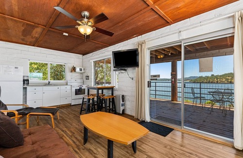 The Lower Main House (called the Studio) is a comfortable, cozy place with great views and perfect for 2 people, but can sleep 4 using the sleeper sofa. It is a small 1 Bedroom/1 Bath with a comfortable main front room with a lake view and a kitchen. Completely remodeled unit Summer 2015 with new bathroom, new floors, new kitchen, new carpet, freshly painted, A/C, and satellite TV; you will love this cool, trendy pad.