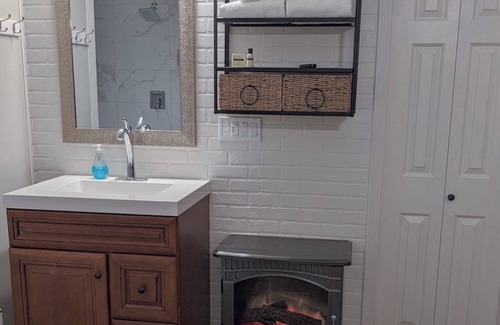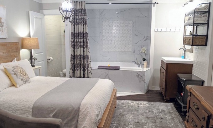 The Nest at Bramblebank Cottages is perfect for a romantic couples getaway! This little hideaway features a large 2-person jacuzzi tub, electric fireplace, queen size bed, kitchenette, and private porch with bistro set.