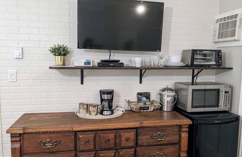 -Mini fridge/freezer, microwave, electric fry pan, coffee maker, toaster oven, kettle, cutlery, knives, coffee mugs, water glasses, wine glasses, corkscrew, and utensils, etc