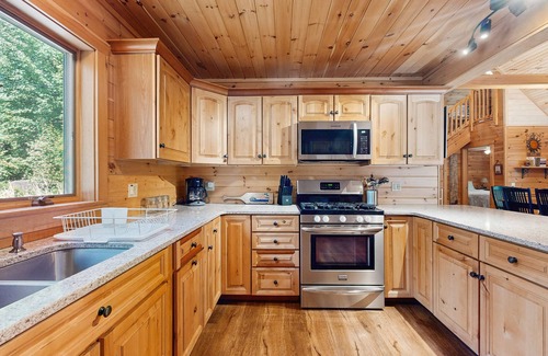 Inside, the cottage exudes charm with floor-to-ceiling wood detail and rustic decor. Create hearty recipes in the well-equipped kitchen, detailed with a full suite of appliances and a three-seat kitchen bar. Gather for special meals at the adjacent dining table, then kick back and relax in the living room and watch TV. Extra perks include room darkening shades in the bedrooms and fast WiFi for remote work or online school.