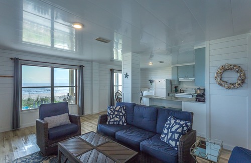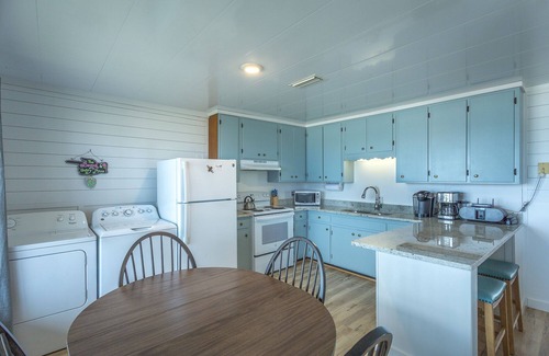 Open concept living area with beautiful views of the ocean through the large picture windows. Internet is included with your stay. The kitchen has been updated with adorable painted cabinets and granite countertops, but still maintains the "Old Florida" charm. Everything you need to prepare meals at home is at your fingertips. *Please note, there is no dishwasher or ice maker.* This home also comes with a full size washer and dryer. Bed linens and bath towels are provided. Starter supply of paper products is also provided. 4 beach towels are available for your use.