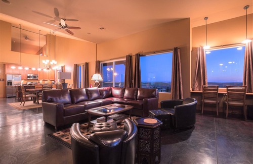 Think of a chic Tribeca loft or a San Francisco modern. Clean and minimalist, but warm and unpretentious, too. Polished concrete floors and 19 foot ceilings. Eight inch moldings. Two big baths with cherry vanities. A double-head granite shower upstairs in the big loft, an over-sized granite tub with shower downstairs. Flatscreen TVs in both sleeping areas with local channels and streaming shows from your favorite online channels. A big screen TV in the living room for hanging out and enjoying a special movie. Cherry cabinets, granite and glass, stainless steel appliances and unique lighting arrangements...and who would guess it?