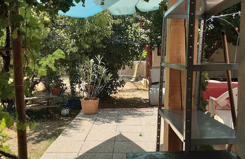 Shed of 12 m2 with a bedroom, a bathroom, toilet, and outdoor kitchen under the shady covered terrace, fridge, hob, ... Electricity, hot water. Linens provided. Garden furniture, deckchairs. Outdoor dining table under the lime tree