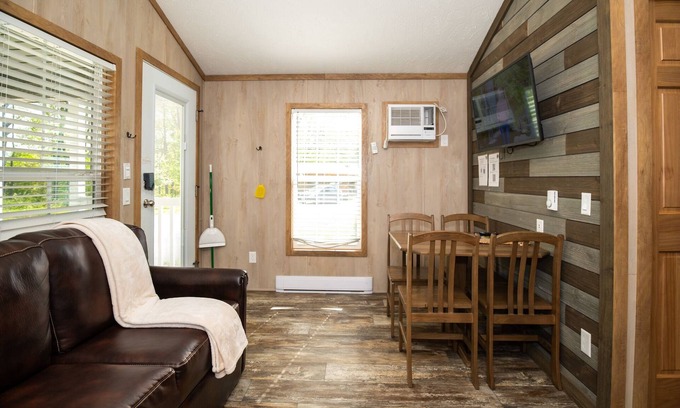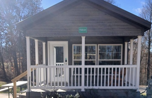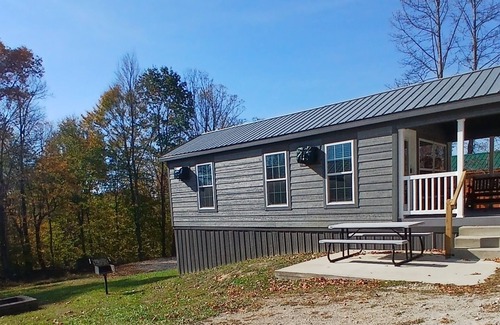 Come enjoy a fully furnished cabin in the quiet wooded hills of Hocking Hills area. Inside the beautifully cabin you will enjoy a living area with a TV, a full kitchen, and a full bathroom. Sleeping accommodations include two bedrooms, one with a queen bed and the other with a bunk bed. The sofa in the living area folds out as a full bed for extra guest. Cabin equipped with a TV in the bedroom, and a TV & DVD player centrally located in the main living area. Central air-conditioning and heat keep the cabin comfortable in all seasons. Your outdoor living space will include a front porch with chairs and a rocker. Each cabin has its own outdoor charcoal grill, composite picnic table, and a grassy area with a fire pit. A parking pad is provided in front of the cabin. All campground amenities are available with this registration. Young children are free, please do not include children 2 and under in your guest count.