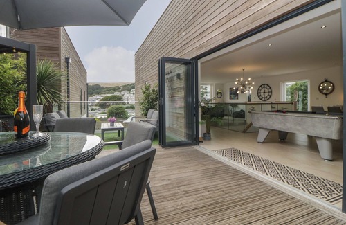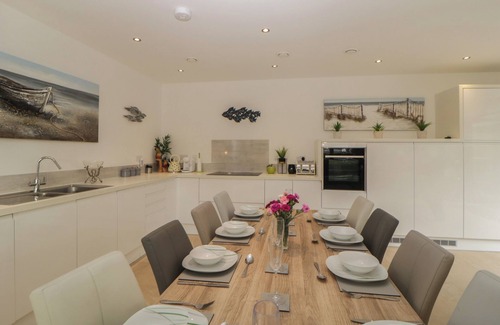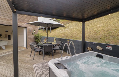 Please note: this property only accommodates weekly bookings starting on a Friday; from 30th August 2025 the check-in day will change to Saturday. This reverse-level home has a first-floor, open-plan living space with kitchen, dining area and sitting area, four ground-floor bedrooms, including a king-size with en-suite, a double, a twin, and a family room, and a ground-floor shower room. Appliances consist of an electric oven and hob, microwave, fridge/freezer, washing machine and dishwasher, and for entertainment, four Smart TVs and a full-sized pool table. Outside there is a decked area with furniture and hot tub, a raised decked area with furniture, a sun terrace with furniture and a three-hole putting green, and a private driveway for three cars. This is a pet-free and smoke-free home. WiFi, fuel, power, bed linen and towels are all included, along with a highchair and two stairgates. You'll find a shop in 0.3 miles, a pub in 0.1 miles, and the beach in 0.9 miles. Head to South Devon at 12 Beachdown. Note: There are steps in the garden; please take care. Note: Guests have access to the neighbouring holiday park and its facilities. Note: Outdoor shower for guest use after beach. Note: Private parking access via electric gates, code required to enter provided before arrival.