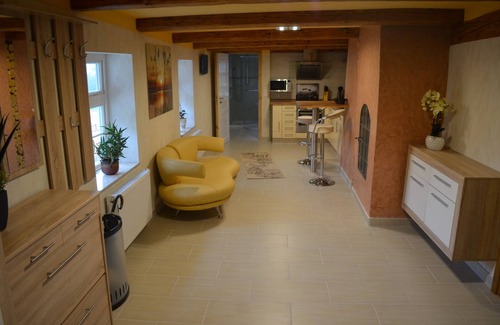 The apartment is on the 1st Floor, in a lovingly renovated 400-year-old half-timbered house. The lower floor is used by us.