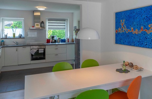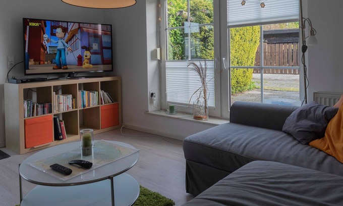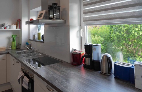 The 70sqm apartment is designed for 1-4 people. The apartment has been equipped with underfloor heating, which offers a very pleasant warmth in the cooler season. It has a large, open living and cooking area, a bedroom, a bathroom and a hallway and a garden with a covered terrace. The modern bathroom offers a spacious shower area. The kitchen is extensively equipped. About the dishwasher, a Senseo machine for making coffee, a microwave, a kettle, the ceramic hob with oven to the fridge with freezer compartment everything is available. The bedroom has a large double bed. The corner sofa in the living area can be reached with a handle to a cozy Lümmelecke or Bedding to be rebuilt. The open living, dining and kitchen area is cozy and stylish - light flooded. The cozy sofas invite you to linger. A CD / radio player, which can also be fed with a USB stick, does not neglect the musical enjoyment. A modern TV invites you to linger on the sofa. For the modern communication of the 21st Century offers you this holiday apartment Wi-Fi.