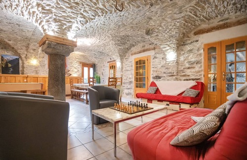 - Large vaulted living room (former stable) including bar, large fireplace, billiards and living-dining room (large table allowing everyone to eat together)