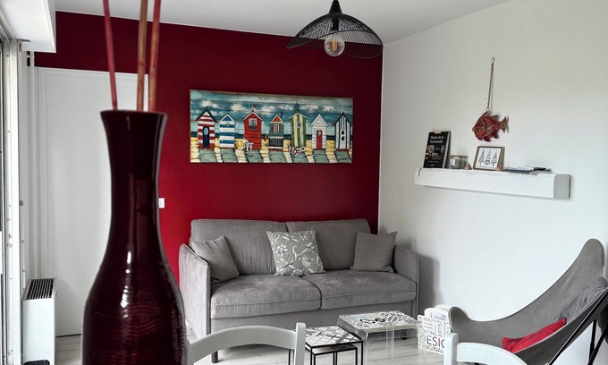 In the immediate vicinity of the beautiful beach of Houlgate and 400 m from its shops and restaurants, stay in a functional and bright apartment of 36 m2, designed to accommodate 4 people. On the 2nd floor with elevator, consisting of a fitted kitchen fully equipped with dishwasher, a living room with sofa bed (140) and flat screen, a bedroom (2 beds 90), a bathroom and a bathroom. toilet.