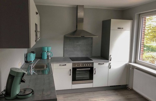 Located in a quiet cul de sac location in Sande-Mariensiel, this modern, light-filled apartment is located on the first floor of a two-family house. 82 square meters spread over 3 rooms, kitchen, bathroom. An outdoor seating is available in the warm season. A lockable garden house offers the possibility to safely store bicycles. The apartment was completely renovated in 2018 and modern furnishings. A private parking space in front of the house also belongs to the apartment.