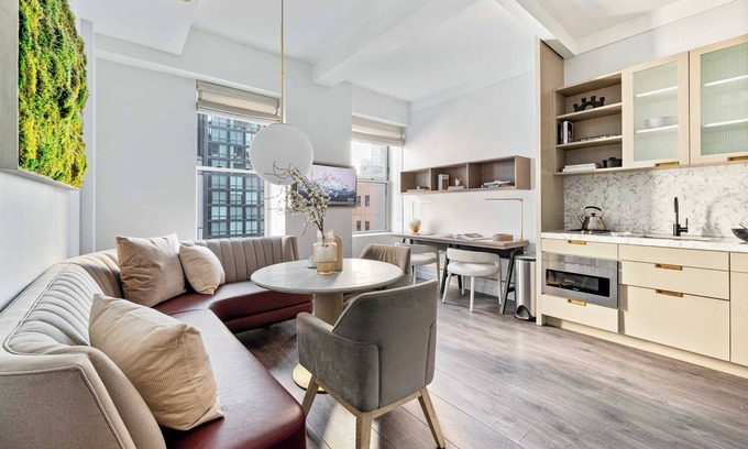 Stay at our BRAND NEW Luxury One Bedroom Apartment at 17John! Welcome to your home away from home in the heart of the Financial District with a fully equipped 500 sf apartment! Our modern accommodations offer the perfect blend of comfort, convenience, and city living. You’ll find everything you need just steps away. There’s a CVS conveniently located on-site for all your essentials, and multiple grocery stores are within a 2-minute walk, making it easy to stock up for your stay. Whether you’re preparing meals in your fully equipped kitchen or grabbing a quick snack, you’re always covered. Enjoy a stunning Manhattan view from our rooftop, or relax in the lounge on the seventh floor. The 9/11 Memorial & Museum is a must-see breathtaking tribute, only a five-minute walk away. Grab dinner at South Street Seaport or admire the historic ships. Find iconic monuments and stunning mid-century architecture on every block. Beyond the essentials, the neighborhood is a treasure trove of iconic landmarks, world-class dining, and cultural attractions. With excellent subway access at Fulton Street Station, you’re perfectly positioned to explore all of New York City. Whether you're here for business or leisure, 17John is your gateway to the best of NYC.