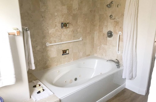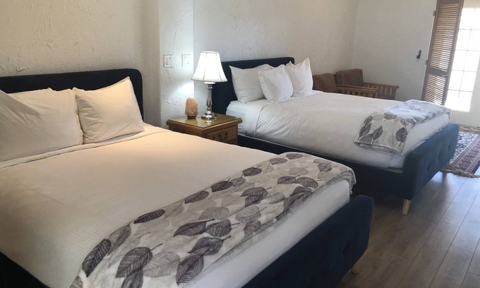 Our Deluxe Double Queen Room will help parents unwind and children have fun by listen to the sound of your crackling fireplace, indulging in your large jetted tub, or enjoying the sunshine on your private patio with pool access. This room will also include a new full kitchen equipped with a Keurig coffee machine, oven, stove,dishwasher, microwave, fridge, and basic dishes and pots-n-pans. This unit also has your own BBQ Grill on the patio. Please, make yourself at home and utilize the two closets and dresser spaces that we have provided. There is also a desk and chair for business men and women who need to work from their room.