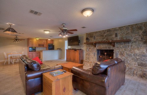6000 sq ft. spacious home located on the crystal clear Nueces River. Enjoy fly fishing, swimming, kayaking, tubing, hiking, biking, bird watching, and star gazing. Accommodations include a fully equipped kitchen, linens and towels provided, multiple break-out-areas, wireless internet, dish satellite, fire pit on the back patio, BBQ pit, pool table, 52-inch flat screen with Blue-ray, and a game room. All accommodations are updated, tastefully furnished and very comfortable. An ideal retreat location for corporate or family events.