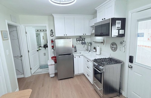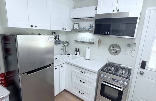 Inside, enjoy a fully stocked kitchen, cozy fireplace, fast Wi-Fi, and smart TVs in both the living room and bedroom. The spacious bedroom features a plush queen bed, while the living area offers a pull-out sofa, perfect for couples, small families, or business travelers. The modern bathroom boasts a sleek, curb-less walk-in shower for a touch of luxury.