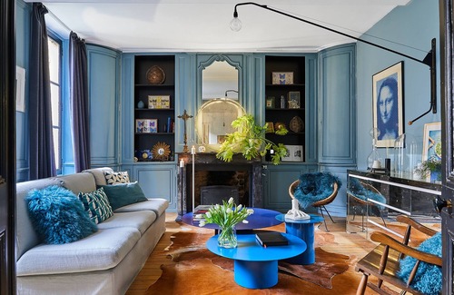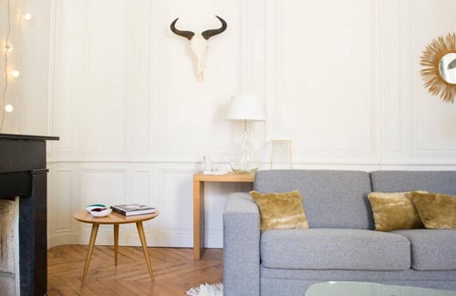 This apartment, for 2 to 4 people, has Haussman-style features with its 18th century wood panelling and chevron-patterned parquet flooring.