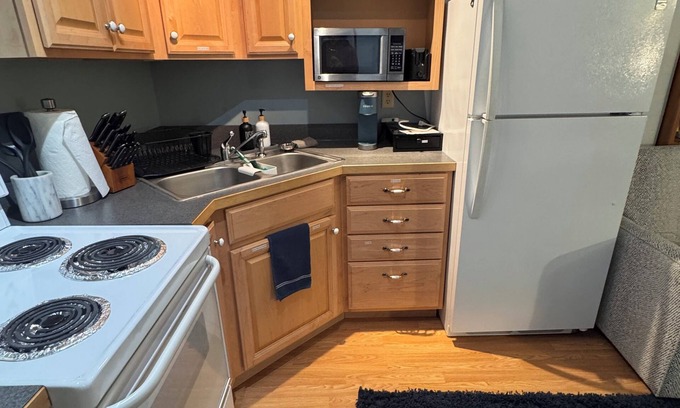 -Full Kitchen (Fridge, stove/oven, microwave, toaster, Keurig, coffee pot, tea kettle)