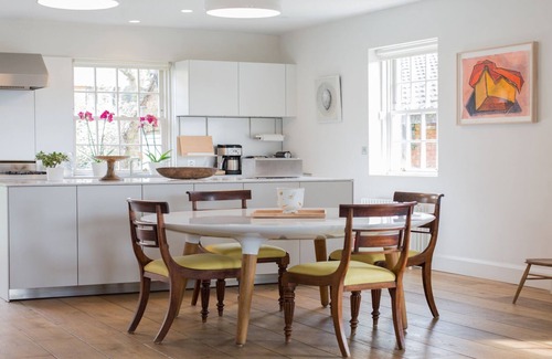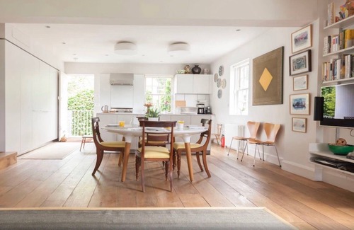 A gated open plan loft-style house with south-facing park views affords seclusion and quiet, despite being central to the centre of London. Blending classic furnishings and contemporary decor throughout, the open-plan ground-floor space is filled with sunlight and brims with books and artwork. The whole family can spend time here, whether it's working from home, studying, cooking or relaxing and streaming after a long day.