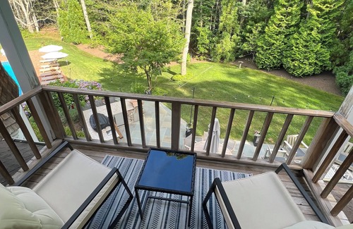 Just off the patio, you’re led to a large heated swimming pool with lounge chairs, umbrellas, and sitting area with Adirondack chairs.