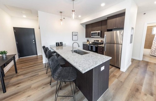 Newly built, fully furnished 2 bedroom 2 bath top floor contemporary apartment under 3 miles from Garden of the Gods for 30 day rent periods or longer. This luxury apartment has it all with stainless steel appliances, granite countertops, 42" soft close cabinets, island with 4 barstools, 9' ceilings, luxury vinyl plank flooring in main living areas, smart TVs in living room and primary bedroom, ceiling fans, fully electric A/C in every room and heat, and a washer and dryer in the unit. The Primary bedroom has a Queen bed, big closet, and luxury spa shower. The 2nd bedroom has a twin size bed with dedicated work space with desk. Enjoy evening drinks on your private balcony with additional storage space, overlooking Ute Valley Park. The outdoor enthusiast will love this location with Ute Valley Park only .4 miles from back door, Mountain Shadows Open Space only 600 ft from front door, and the famous Garden of the Gods Park not even 3 miles away. Bring your Mountain Bike and take off. All utilities and Wi-Fi are included in rent. Furry Friends Welcomed.
