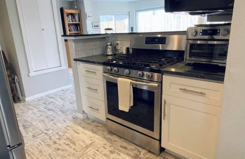 Private house separated from the guest house with separate driveway and parking. Main bedroom has a queen bed and carpeted floor. Second bedroom has full bed and is shared with the office for remote work. This room is very bright and sunny. Living room has a microfiber recliner couch and flat screen smartTV . Open kitchen with breakfast counter and dining room. Fully outfitted Stainless kitchen with gas stove, microwave, dishwasher, and refrigerator. Full cooking ingredients and condiments. Work space desk with large window to backyard. Rustic common backyard for relaxing in nature. An outdoor seating area under a gazebo is a nice bonus for eating, reading, and lounging. This our occasional private residence, and you'll find a few personal items in the house.