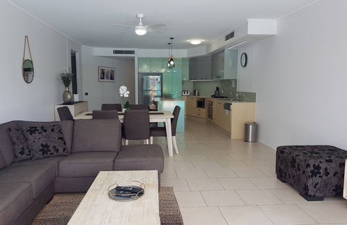 Guests will enjoy fabulous views overlooking the beautiful Strand and beyond from one of the biggest balconies in Townsville. This spacious resort style unit has an open plan self-contained kitchen, dining and lounge. The luxurious master bedroom with ensuite includes a large bathtub as well as double vanity, separate shower and toilet. Both bedrooms have their own TV.