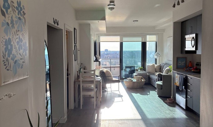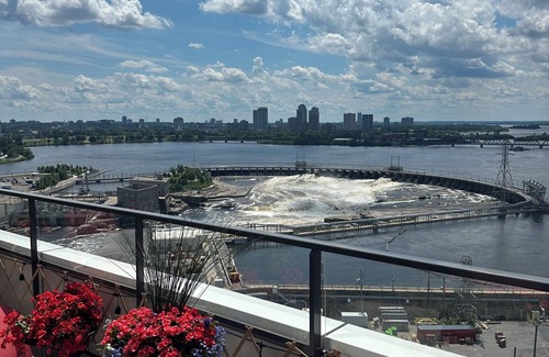 Experience Ottawa/Gatineau like a local in this 2-bedroom apartment overlooking the Chaudière Falls. A view that will blow you away. This gorgeous property features 1 queen bed and 1 full bed. It includes a fitness room, party room, game room, theatre room, AC, WiFi, and a cozy living room with an additional full bed. Enjoy a peaceful stay with all the comforts of home, including a hair dryer, iron, and washing machine. A quaint retreat for guests looking to relax and unwind in the heart of the city. You are right downtown Ottawa. Dining and resting, you can fit up to 6 people. The balcony only elevates the space. A great place to call homebase while you're away, we hope you enjoy your stay.