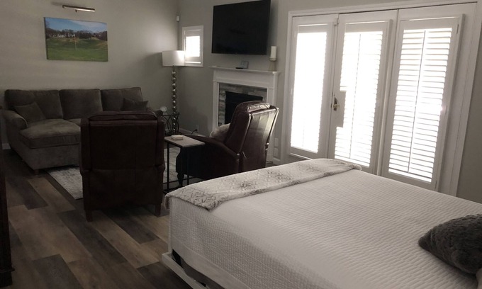 Peaceful and centrally-located 2-story open floorplan. 2 queen beds and 2 full baths. Beds are not separated by doors but on 2 levels. Equipped kitchen and living space for 4. At Norwich Inn & Spa with 2 outdoor pools, jacuzzi and sauna at no cost. Inn has 2 restaurants and full-service spa. Indoor pool use if purchase spa service. Norwich Golf course abuts grounds and club is a 2-hole walk and across a street. Nice to walk along paths/sides or at off times. Mohegan Sun Winter Garage is 1 mile.