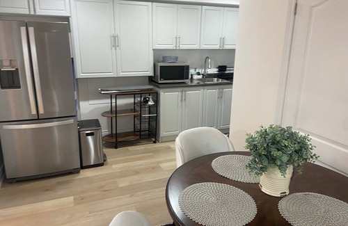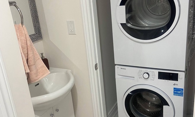 This lovely space features 2 full beds, a cozy bathroom with a shower, a powder room, a comfortable living area with smart TV (Netflix, Prime TV, local channels), a dining area, kitchenette (with utensils, pots, glassware), laundry room with washer & dryer, and convenient amenities like hi-speed WiFi, AC/heating. Microwave, fridge, Keuring coffee maker, toaster, kettle, blender all available in the kitchenette.